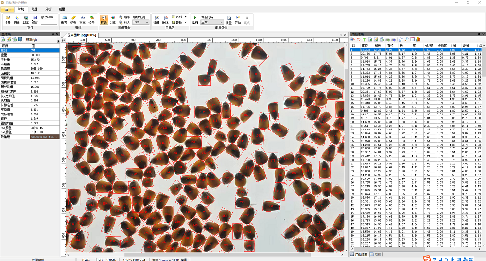 5、能自動(dòng)測出各類粘連種粒的每粒粒形參數(shù)(長、寬、長寬比、面積、等效直徑、周長等),能精準(zhǔn)顯示種粒外接矩形,并可自動(dòng)排序輸出,及可輸出粒徑分布圖表。