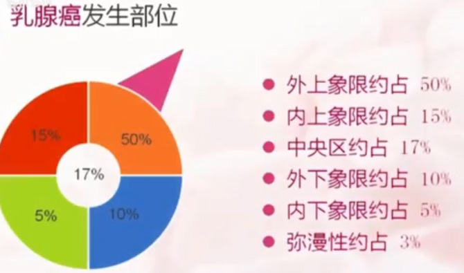 超聲影像最終的目的是要找出乳腺癌,做乳腺檢查的人絡繹不絕。那什么是乳腺癌呢?它有什么危害呢?乳腺癌是指發(fā)生于導管上皮,及末梢導管上皮的惡性腫瘤。乳腺癌的危害,一是致殘摧毀女性的自信。二是發(fā)病率及死亡率在所有惡性腫瘤中排名第一。對家庭的危害極大,婦女能頂半邊天,半邊天沒有了,這個家就相當于塌了一半。乳腺癌的常見發(fā)生部位,外上象限約占50%,內上象限約占15%,中央區(qū)約占17%,外下象限約占10%,內下象限約占5%,彌漫性約占3%。乳腺癌術后5年生存率一期:80-90%,二期:60-70%,三期:40%。因此 提高乳腺癌生存率和降低死亡率的關鍵在于早發(fā)現(xiàn)早診斷早治療。