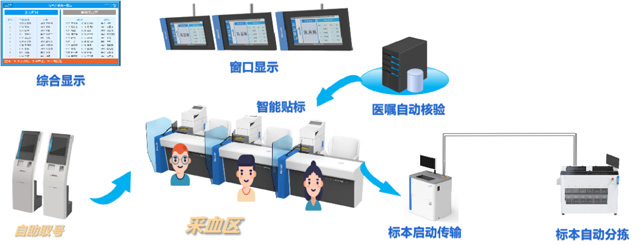 采血流程:患者到窗口采血-掃碼或讀就診卡-核對(duì)檢驗(yàn)項(xiàng)目-打印標(biāo)簽-選擇試管-粘貼試管-護(hù)士采血。人工采血存在問(wèn)題人工選管、打印、粘貼,勞動(dòng)強(qiáng)度大。容易出現(xiàn)人為錯(cuò)誤。貼歪、貼倒(不能識(shí)別)。位置錯(cuò)誤(流水線無(wú)法識(shí)別)。視窗覆蓋(無(wú)法觀察血液情況)??赡艹霈F(xiàn)漏采或多采血。智能采血設(shè)備解決采血人的排隊(duì)難題,智能采血管理系統(tǒng)把采血管的準(zhǔn)備工作自動(dòng)化,縮短等待時(shí)間。采血流程需要全面的優(yōu)化,報(bào)到取號(hào),65歲以上老人優(yōu)先。智能叫號(hào)不需要長(zhǎng)時(shí)間的排隊(duì)。采血管容量大,處理速度快,能有效加快采血速度,提高采血服務(wù)質(zhì)量。自動(dòng)化代替了傳統(tǒng)人工的操作模式。自動(dòng)識(shí)別自動(dòng)貼標(biāo),自動(dòng)標(biāo)本核收。大大的減少人工誤差。也減少繁雜的采血前準(zhǔn)備,系統(tǒng)具有諸多優(yōu)勢(shì),將為客戶帶來(lái)全新的體檢體驗(yàn)。
