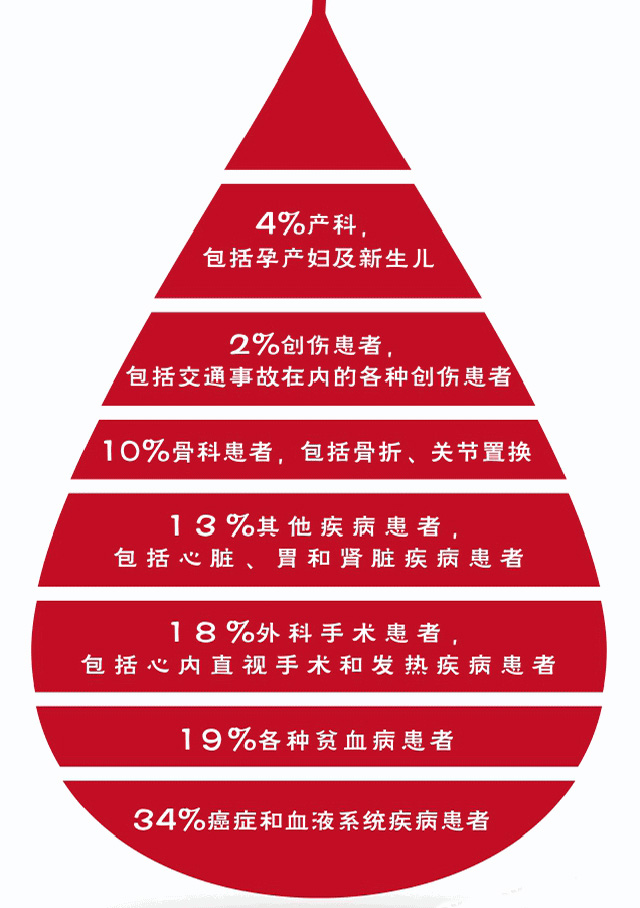 也就是大家獻的血經(jīng)過分離檢驗存儲后送到各大醫(yī)療機構用來對有需要輸血的病人輸血救治。其實我們很多人有個認識誤區(qū),以為血液就是在災難時候才需要獻血,其實醫(yī)院每天有不少病人需要各種血液成分來搶救治療。大量失血的病人,外傷大出血,大型手術跟其他原因低血量,輸血來補充血液,血液大部分用于癌癥跟血液疾病的病人。慢性失血、紅細胞被破壞或白蛋白合成不足。如血友病、血小板減少癥或血小板功能障礙。凝血異常導致失血,具體來講血液有個使用比例數(shù)據(jù)。有助于挽救生命延長生命提高生活質(zhì)量。