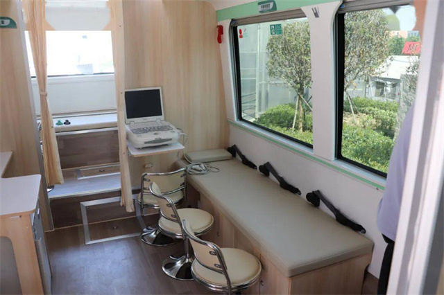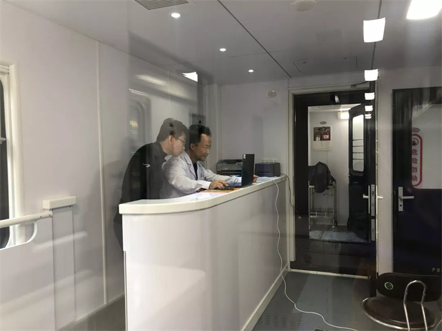 體檢車上都有這些檢查室?車廂里有男女彩超室,男女心電圖室,內(nèi)科、外科以及,骨密度、碳十三檢測(cè)室等,可以對(duì)血常規(guī)、肝膽功能,腎功能、空腹血糖、尿常規(guī),心電圖、肝膽胰脾B超等項(xiàng)目進(jìn)行檢查。車上都有這些功能室?候診登記處可以在候診區(qū)等待就診,各類醫(yī)療用品和采樣冷藏柜也很完善。體檢車廂配置了全自動(dòng)生化分析儀、全自動(dòng)尿液分析儀、B超檢查室、心電圖檢查室等,可以進(jìn)行前臺(tái)導(dǎo)診、采血、尿液檢查、實(shí)驗(yàn)室化驗(yàn)、DR拍攝、超聲心電檢查等項(xiàng)目,能夠?yàn)槁毠みM(jìn)行全面體檢,最快當(dāng)天即可出結(jié)果。
