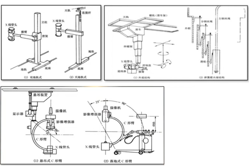 落地式:分為雙地軌式X線管組件支持裝置、天地軌式X線管組件支持裝置和攝影床一體化式X線管組件支持裝置。雙地軌式X線管組件支持裝置:立柱由兩條地軌支持,立柱固定在底座上,底座在雙地軌上滑動,帶動立柱和X線管組件在雙軌道上縱向水平移動。這種立柱支持方式對機房高度無特殊要求,安裝方便,缺點是地面軌道較多,顯得不整潔。天地軌式X線管組件支持裝置:立柱由一條地軌和一條天軌支持,其主體由立柱和連接桿組成。連接桿可上下伸縮,以在一定范圍內(nèi)適應不同高度的房間。天軌不承重,只起支持作用,安裝不太復雜,應用較多。這種結構形式地面上只有一條軌道,較為整潔。懸吊式X線管組件支持裝置與前面落地式X線管組件支持裝置相比,結構復雜、安裝難度較大、相對成本較高,但它能充分利用機房上部,具有運動靈活、操作方便、運用范圍廣的特點,所以特別適用于多功能X線攝影。懸吊式X線管組件支持裝置由固定縱向天軌、移動橫軌、滑車、伸縮架、橫臂、控制盒和X線管組件等組成。為適應各種不同X線特殊檢查而設計的,名稱因其形狀而來。C形臂的一端裝X線管頭和遮線器,另一端裝攝影轉換和記錄裝置如影像增強器、電視攝像機、點片照相機和電影攝像機等。C形臂式可以和懸吊臂式的裝置結合,組成懸吊式C形臂支持裝置可以與專用底座結合成落地式C形臂支持裝置。