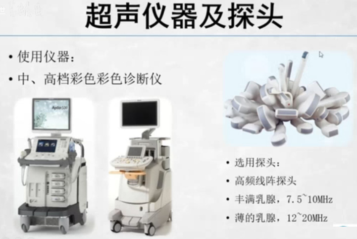 那么使用的設備呢要求是中高檔的彩色診斷儀。探頭型號非常的豐富,針對不同的器官采用不同的探頭。檢查乳腺使用高頻線陣探頭,穿透力分辨率,豐滿乳腺,采用7.5~10MHz探頭,薄的乳腺乳腺小的患者,采用12~20MHz探頭。乳腺的掃查方法有兩種,看個人的習慣,一是從上到下,左到右,移動探頭逐一切面掃描探頭不要跳躍。采用聯(lián)網(wǎng)式,二是順時針或者逆時針方向,由乳頭為中心輻射狀掃描檢查。乳頭向外掃查,乳頭向內(nèi)掃查都可以。最重要的也是探頭不要跳躍,一定要采用聯(lián)網(wǎng)式的檢查。采用哪種方法,按照習慣選擇。乳腺的掃查的范圍有外向內(nèi)向外線內(nèi)線,乳頭中央?yún)^(qū)、向外延伸的腋尾區(qū)、腋窩、淋巴結(jié)四個象限。疊瓦式,剪草機式不放過任何位置。正常乳腺超聲標準斷面,經(jīng)乳腺腺體最厚處、通常于外上象限取得,在此段面測量乳腺厚度。